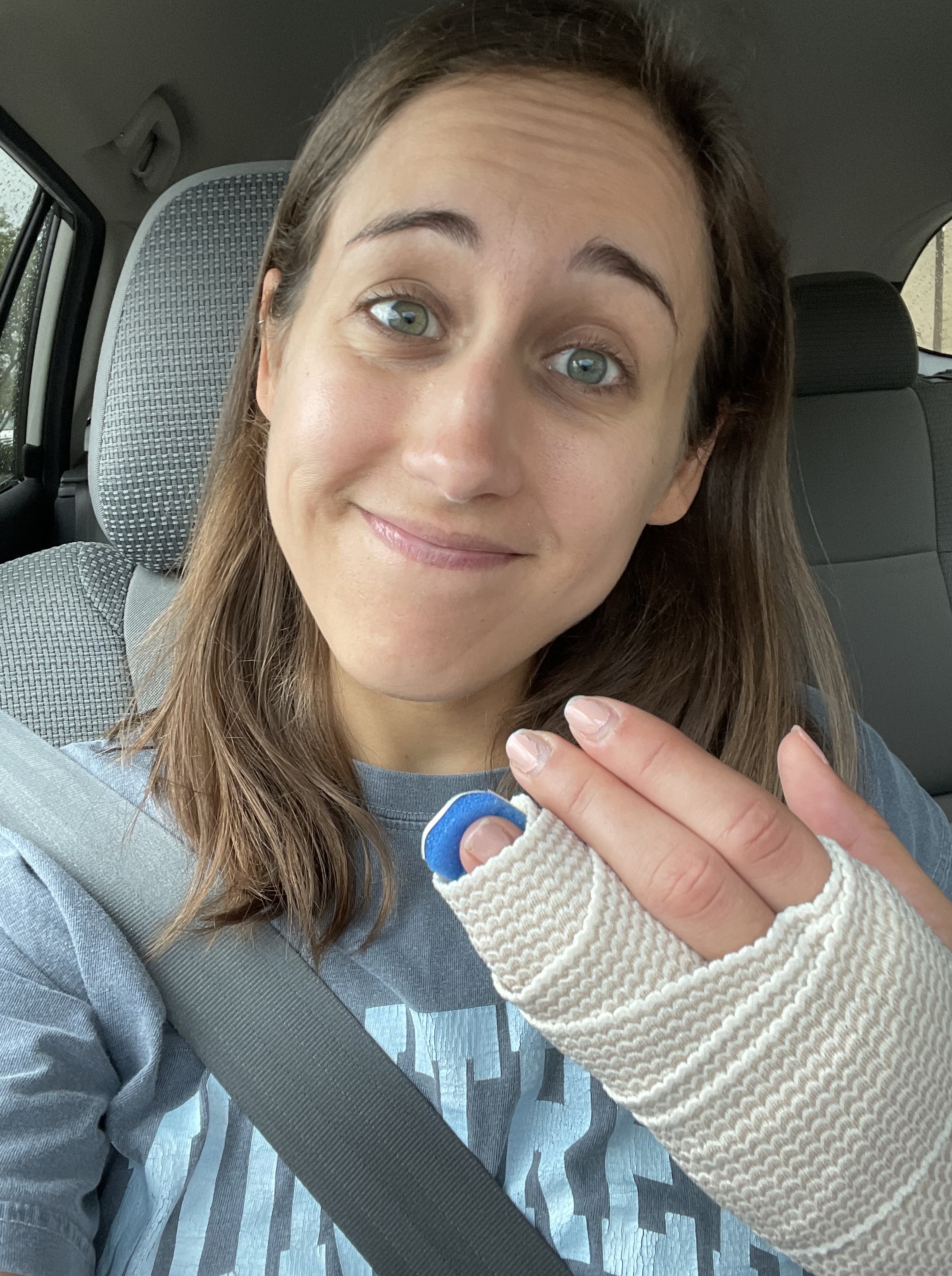 After a few halfhearted pulls, I decided to leave, my hand throbbing as I drove home one-handed. When I got there, I woke Daniel up and said, “I think I hurt myself.” I took the first of many one-handed showers and decided to call the walk-in clinic associated with my doctor’s practice. (I really didn’t want to go to the ER.) They could see me at 2:00.